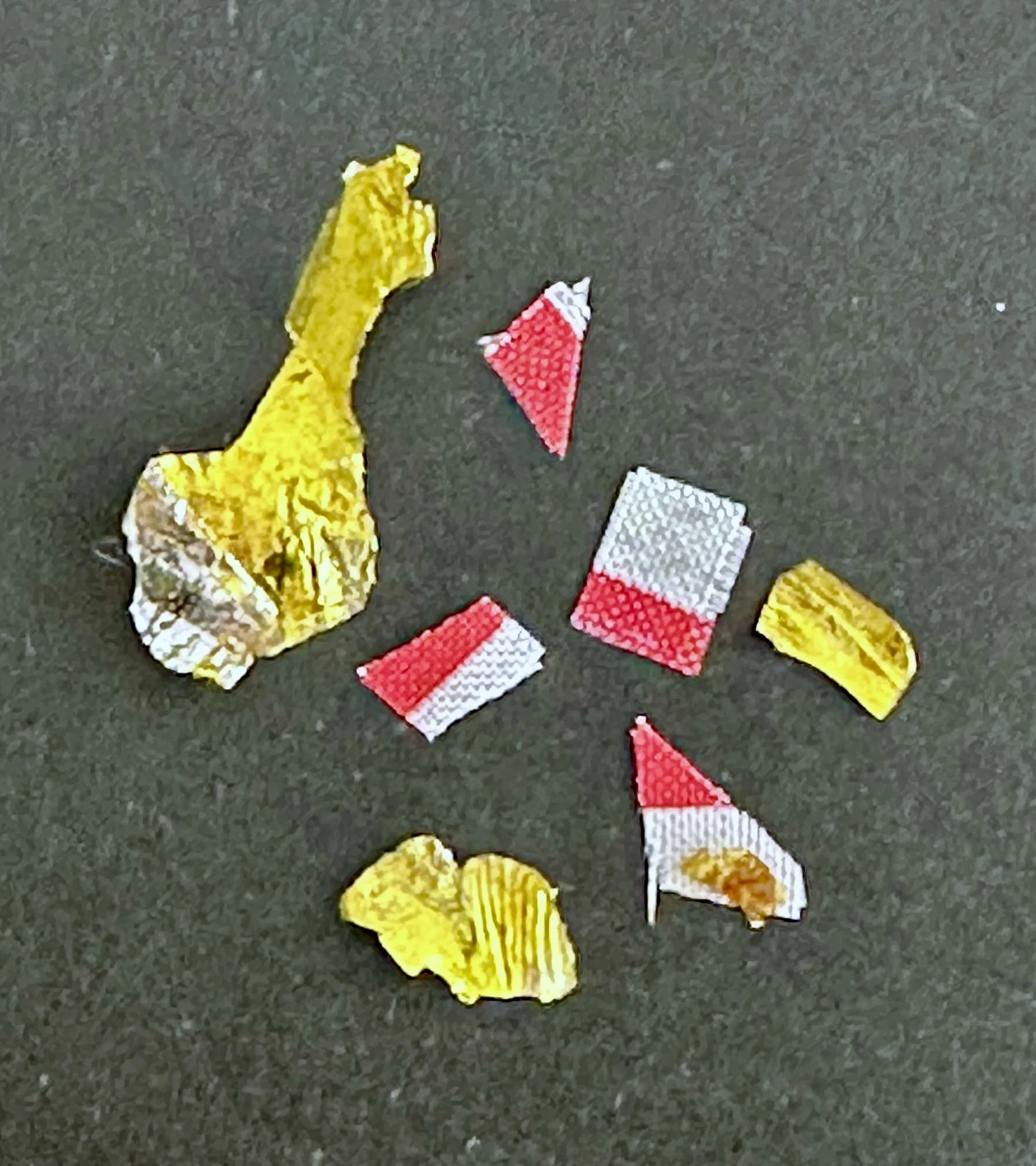 To add to the unique character of his paintings, and to give them the very personal touch of a man fortunate to have walked on the Moon, he cut small pieces from the U.S. flag or from his name tag or the NASA and Apollo 12 mission patches that were sewn on his space suit and backpack and fixed them on the textured surface, using a thin acrylic medium. Because Bean and Conrad spent more than seven hours outside the lunar module and got their suits very dirty as they worked, each of the fragments is impregnated with small amounts of lunar dust. As a final touch, Bean added small pieces from the gold Kapton foil that insulated the command module Yankee Clipper's hatch leading to the lunar module Intrepid. He also added charred particles from Yankee Clipper's heat shield. Thus the base layer of all of his paintings contain small pieces of his space suit and the command module and also very small amounts of Moon dust. Finally, the paintings, themselves, convey unique memories of an unique era.